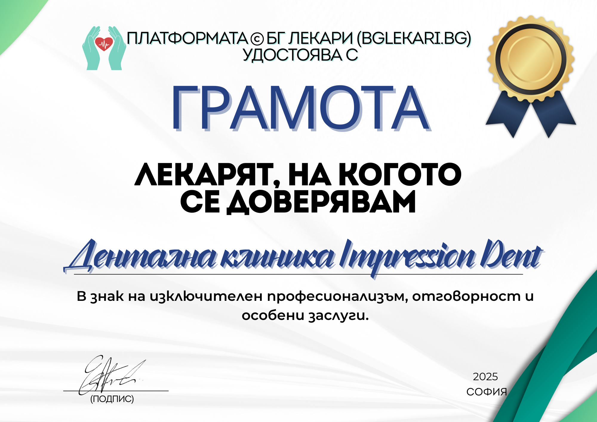 Специалистите в Impression Dent са доказани професионалисти с редица престижни отличия у нас и в чужбината. Клиниката е двукратен носител на награда "Дентална клиника на годината" за 2021 и 2024 година и финалист в годишната класация "Компания на годината" в категория "Медицина" на сп. Forbes за 2025г. Можете да видите отблизо работата на нашите специалисти и в национален ефир в рубриката "Моето ново Аз" по bTV.