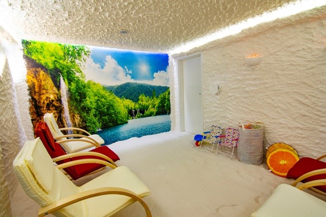 Стените, таванът и подът на солната стая са покрити изцяло със суха сол (около 1000-1500 кг), която в дълбочина достига до 15 см. За разработването на стаята се прилагат определена влажност, температура и аерозолна концентрация. В стаята има шезлонги, на които гостите се разполагат в легнало или седнало положение, за максимално удобство. Сеансите траят около 20-40 минути, като за пълен комфорт, спокойствие и отпускане допринасят приглушената светлина и успокояващата музика. За децата има специално оборудване, като освен това те могат да си играят, правейки си замъци от сол, също като на плажа. През цялото това време аерозолът, който се вдишва, прави това, за което е предназначен – лекува всички болежки на дихателната система, нервите и кожата.