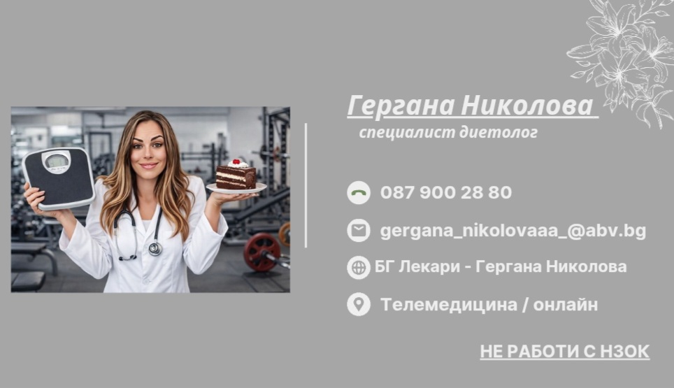 Казвам се Гергана Николова и притежавам две магистърски степени по "Храни и хранене" и "Здравен мениджмънт'', като в момента продължавам обучението си и работя по докторската си степен. Регистриран диетолог и специализация по ''Здравословно и диетично хранене'', както и притежавам професионална квалификация ,,Производство на кулинарни изделия и напитки" и допълнителна квалификация - "Производство на хляб, хлебни и сладкарски изделия". Работя дистанционно, като специалист диетолог в гр.Монтана. Практикувам и чрез телемедицина. Към този момент работя и като спортен диетолог във фитнес зали.