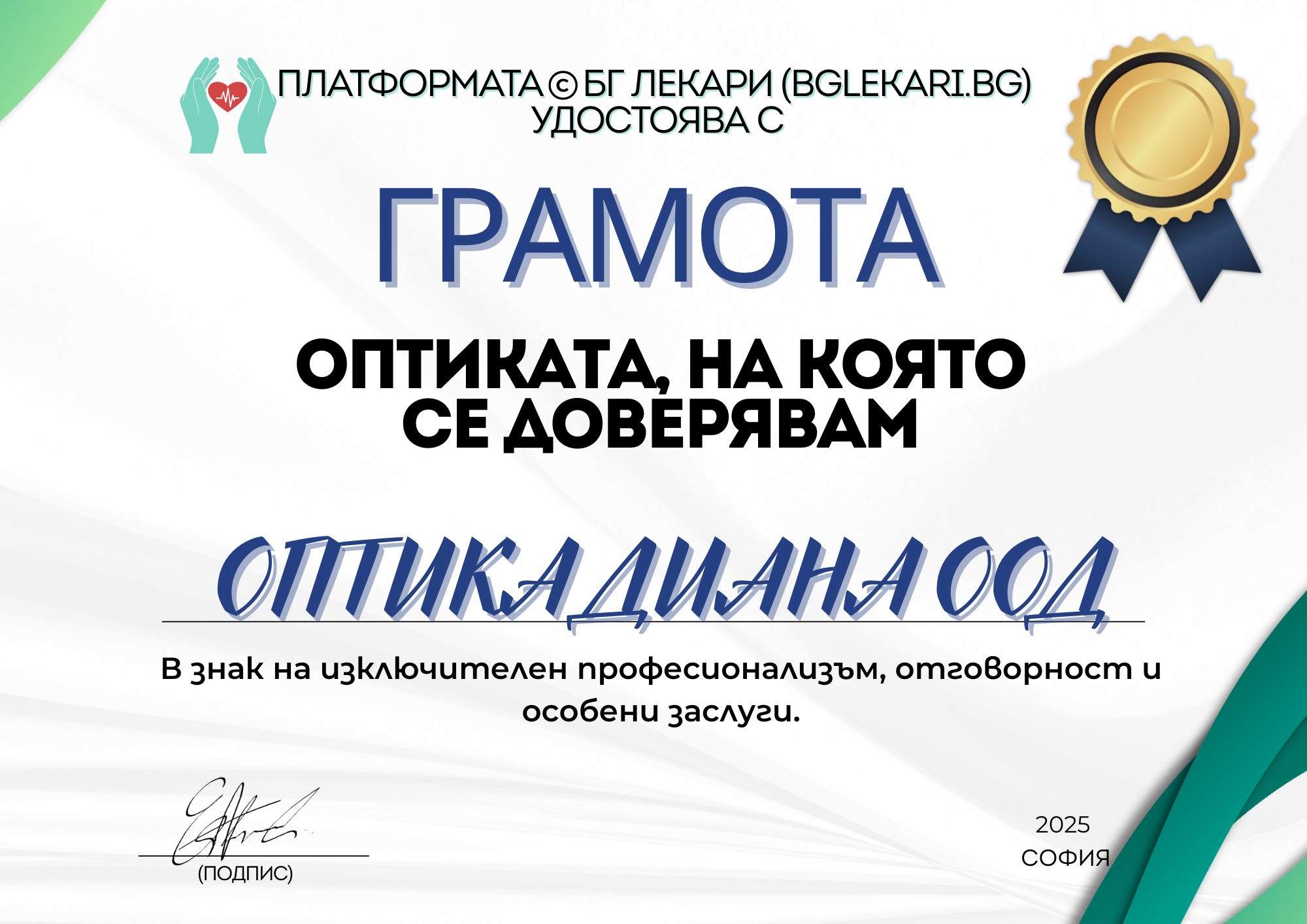 Оптика град Плевен; ОПТИКИ ДИАНА ИВАНОВА ООД - Диоптрични очила и рамки, контактни лещи; Прегледи от очен лекар; Преглед от офталмолог; Оптика Плевен, ж.к. Сторгозия; Оптика ул. Раковски, Плевен