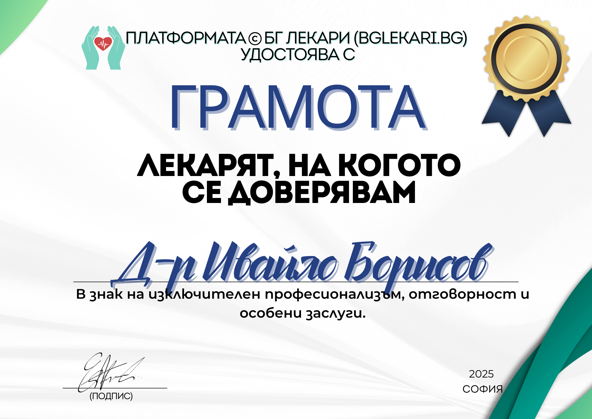 Д-р Ивайло Борисов - 20 години трудов стаж, с призната специалност по “Ортопедия и травматология” има завършени квалификационни курсове по ултразвукова диагностика на тазобедрените стави при деца, артроскопия на колянната става